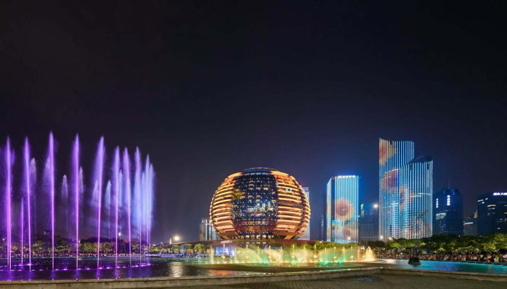 在众多酒店当中,有一家酒店非常特别,它凭借得天独厚的地标优势,推出了观赛+酒店的文旅产品。这家酒店就是被称作杭州地标大金球的杭州国际会议中心洲际酒店,它以金碧辉煌球形的外形著称,象征着金色的太阳,与弯月造型的杭州大剧院遥相呼应,成为日月同辉的独特景致,照片经常出现在各种杭州要闻的封面上。